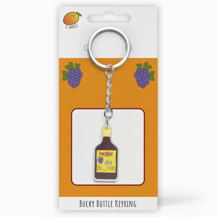Acrylic keyring in the shape of a bottle of Buckfast Tonic Wine.
