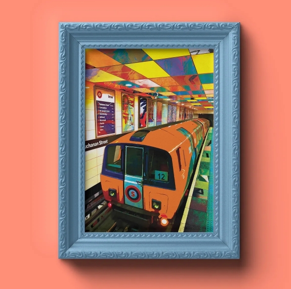 This colourful digital art print is an original design by Glasgow based illustrator Prints Pylons. Inspired by the Glasgow subway, known locally as the Clockwork Orange.