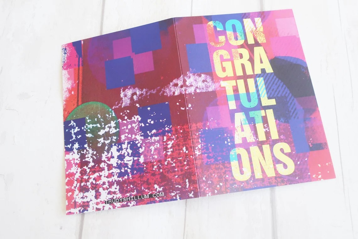 A blank alternative grunge modern “congratulations” greetings card. Card has a wrap around design, so it’s just as pretty on the back as the front. Designed in Glasgow by Trudy Shillum.