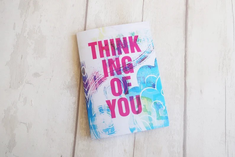 A blank, alternative & modern “thinking of you” greetings card. Card has a wrap around design, so it’s just as pretty on the back as the front. Designed in Glasgow by Trudy Shillum.